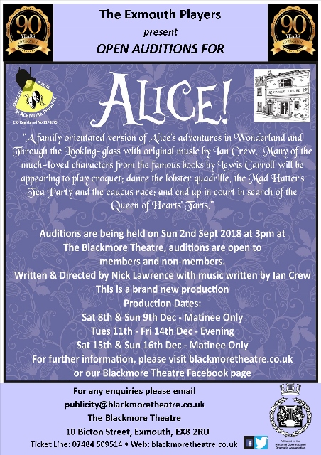 We are well on the way with the planning for our production of “Alice!” Please note the date of the auditions. As the composer will need to be in attendance there will be no opportunity for other audition dates.